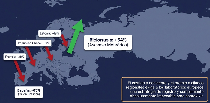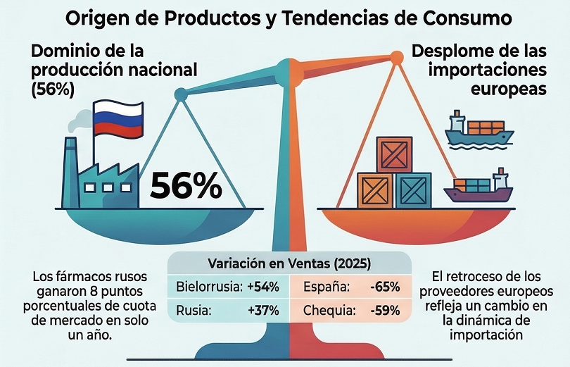La caída de la presencia europea es drástica. Aunque oficialmente los medicamentos no están incluidos en las sanciones internacionales contra Rusia, estas han impuesto barreras logísticas, financieras y administrativas que dificultan enormemente la exportación. Los fabricantes europeos enfrentan hoy desafíos sin precedentes para mantener su cadena de suministro y entrar al mercado.