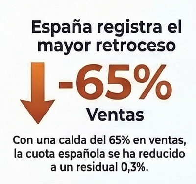 - Tasa de Mercado y Caída: La participación de España en el valor total de las ventas minoristas se situó en un residual 0,3% en 2025. Esta cifra es el resultado de una caída drástica del 65% en sus ventas interanuales, la mayor contracción registrada entre todos los exportadores analizados.